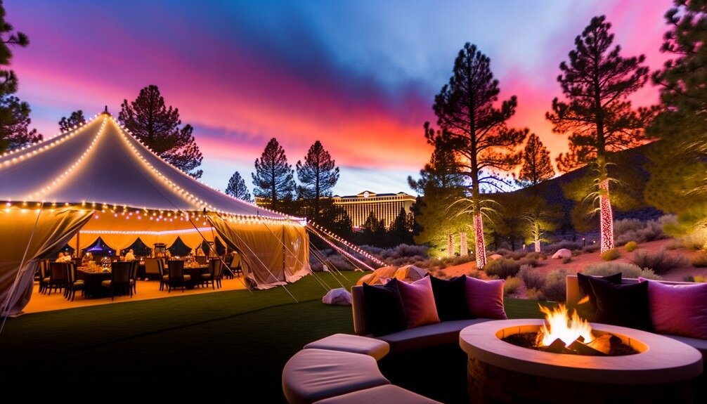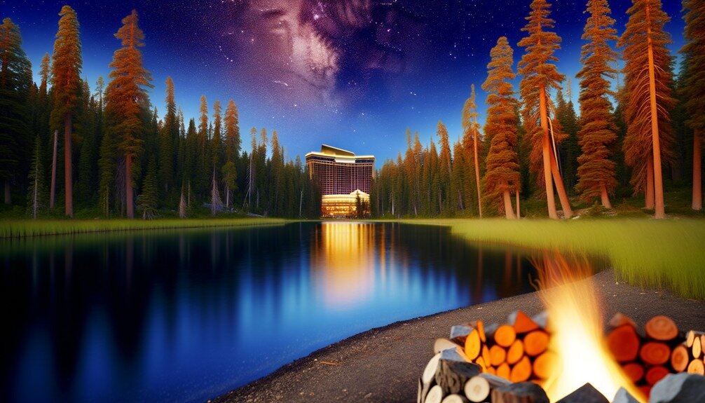 Imagine setting up your tent under a blanket of stars, just a stone’s throw away from a vibrant casino floor. The excitement begins at resorts like Lake Tahoe’s Harrah’s, where you can camp amidst towering pines and stunning lake views. After a day of hiking, you can indulge in fine dining or try your luck at the slots.